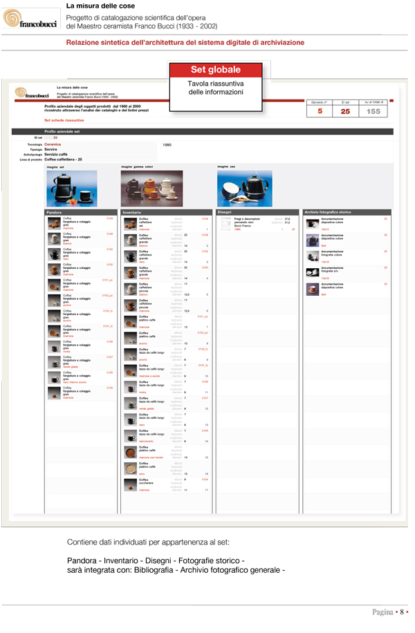 Il lavoro consiste nella riorganizzazione, quantificazione e analisi qualitativa del patrimonio ceramico di Franco Bucci, una complessa opera di catalogazione non solo di singoli oggetti e opere uniche, ma soprattutto di un vero e proprio “sistema” di produzione, con linee di prodotto, varianti di colore e prove di forma. Oltre alla ceramica nell’archivio sono presenti disegni, riviste e fotografie storiche la cui esistenza documenta e completa la storia umana e professionale di cinquant’anni di attività.