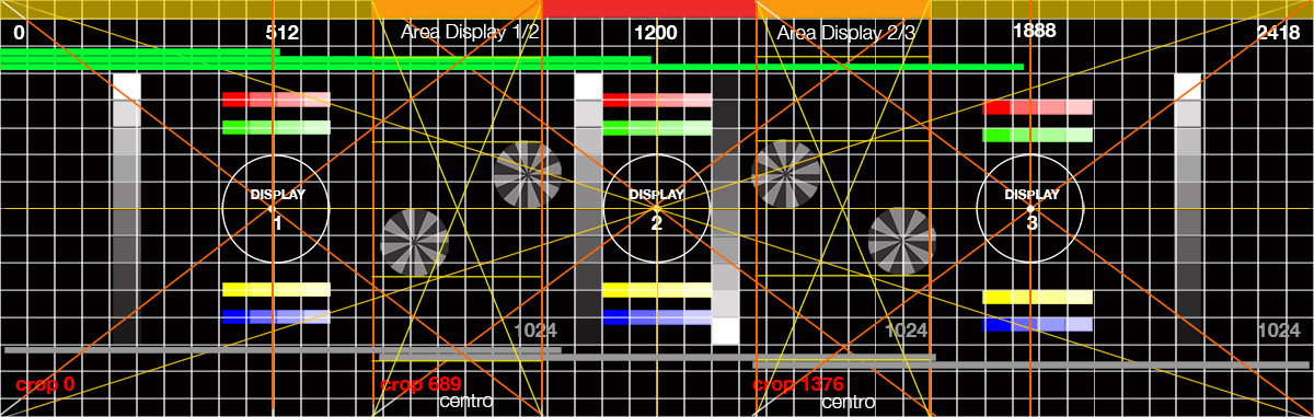 Display di proiezione multi-proiettore con segni di posizionamento, colore e misura.